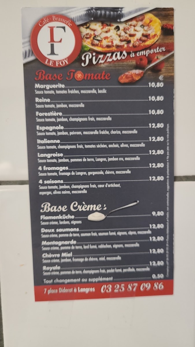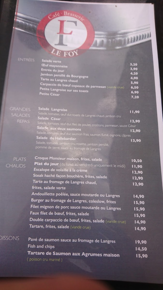 Welcome to Le Foy, a charming eatery nestled in the heart of Langres, France. Located at 7 Pl. Diderot, this delightful restaurant offers a diverse menu that showcases the best of traditional French cuisine.